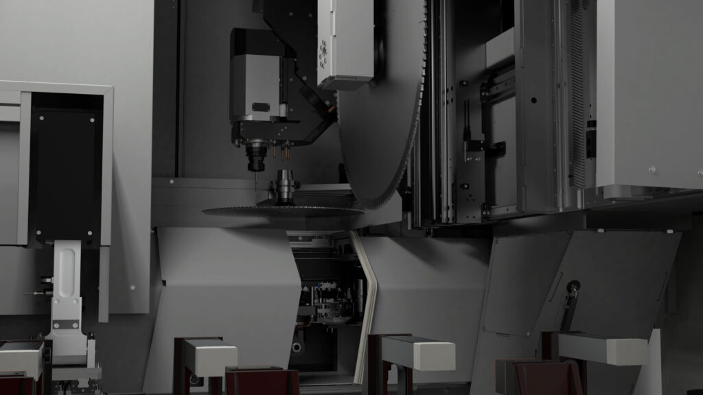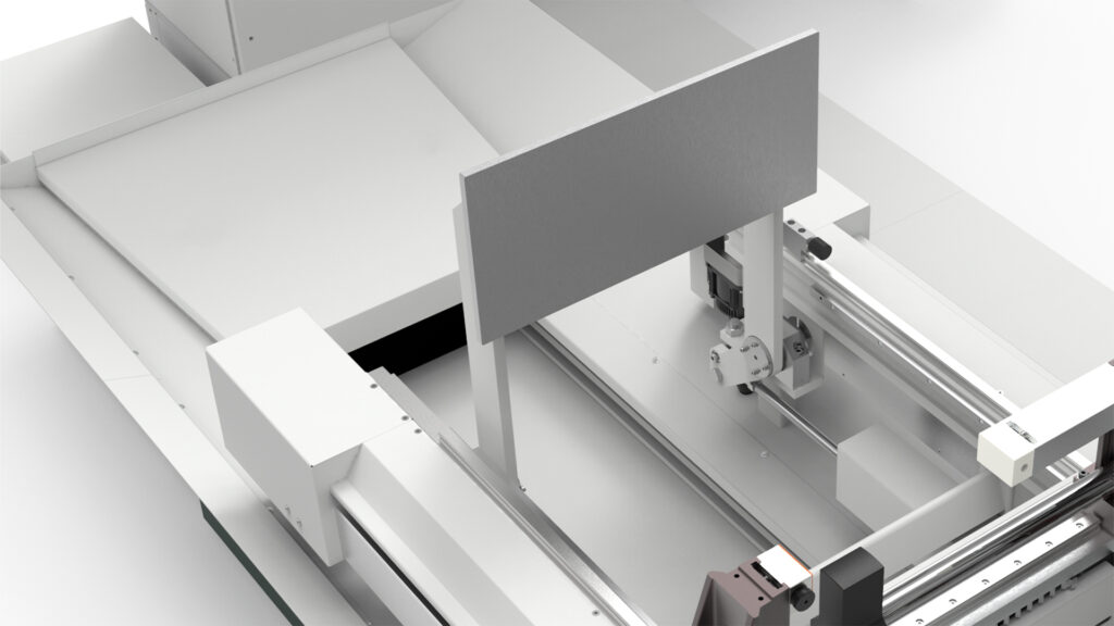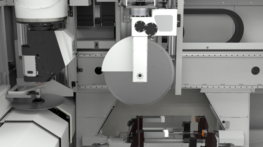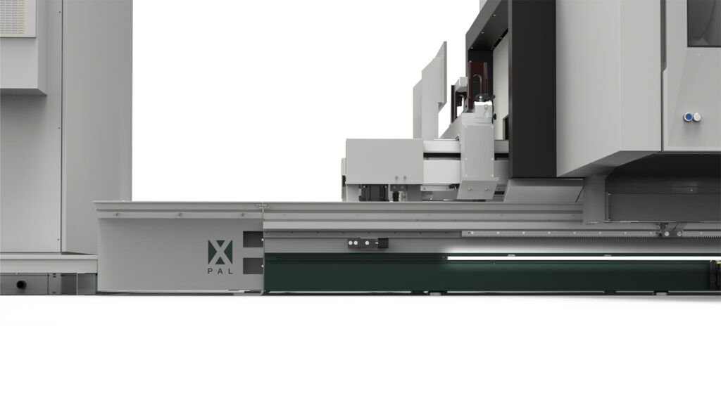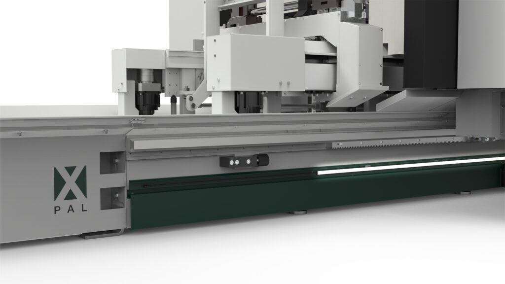 Machining centre with 5 interpolating axes for machining on 5 faces of aluminium profiles with a cross-section of 580 x 400 mm and steel tubes up to 5 mm thick. HSK E63 22 KW 24000 rpm liquid-cooled electrospindle allows the production of custom machined and milled elements. According to the configuration chosen it is possible to carry out single area, double area, pendular or multi-piece machining (up to 8 pieces with XPAL). 6 versions are available according to the length of the machine bed and whether or not cutting unit X2 is present.